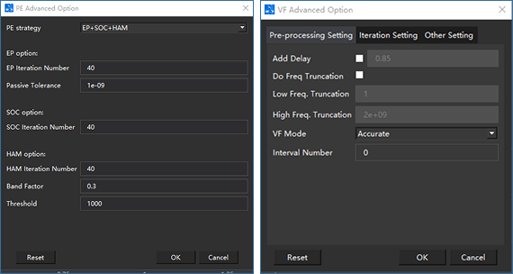 集成了专门开发了对PDN结构的S参数可以抽取具体物理意义等效模型的算法;对PDN拟合后低频不精确的问题进行了精度加强。
