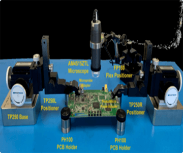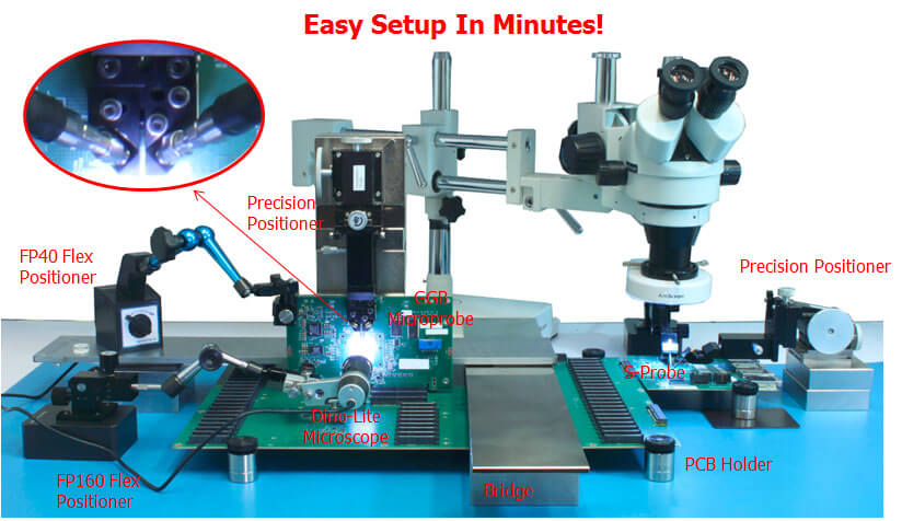 非常适合射频电路板开发中需要的精确 S 参数测量。 该探针台由两个单端 GHz S 探头、两个 TP250 探头支架、一个 TCS70 校准基板、一个 FP40 Flex 定位器、 一个 AM4113ZTL Dino-Lite 数字显微镜和四个 PH100 PCB 支架组成,工程师无需将同轴电缆焊接到被测电路板上即可完成射频测量。