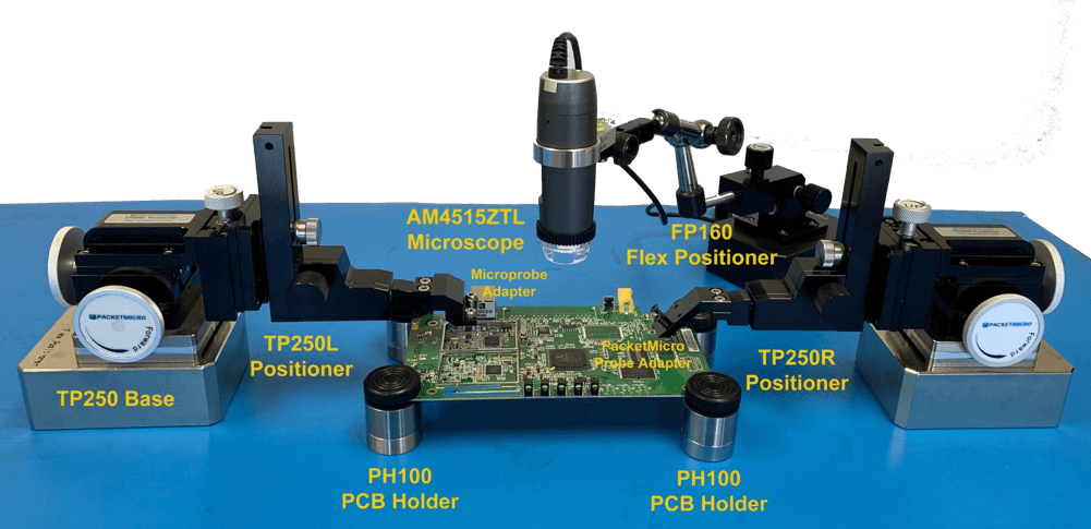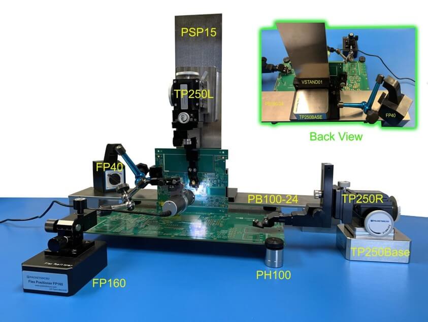 Flex探针台是最灵活的台式测量系统,可搭配微探针和PacketMicro的差分探针和单端探针。它包括 TP250探针支架、FP160和FP40型显微镜支架、 PB100 桥式支架座、PCB 支架和显微镜。用户可以轻松配置Flex探针台,可以在几分钟内完成装配并开始进行对PCB的垂直和水平方向的测量。
